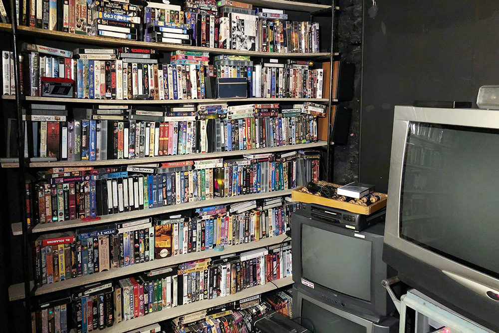 Попадая внутрь, оказываешься в темной комнате с мягким диваном и огромным телевизором, купленным на «Авито». Вдоль одной из стен — высокий стеллаж с коллекцией VHS-кассет, которых, по словам владельцев видеосалона, около 800 штук. Среди них есть как «классика» из 1990-х, так и более ценные экземпляры.
