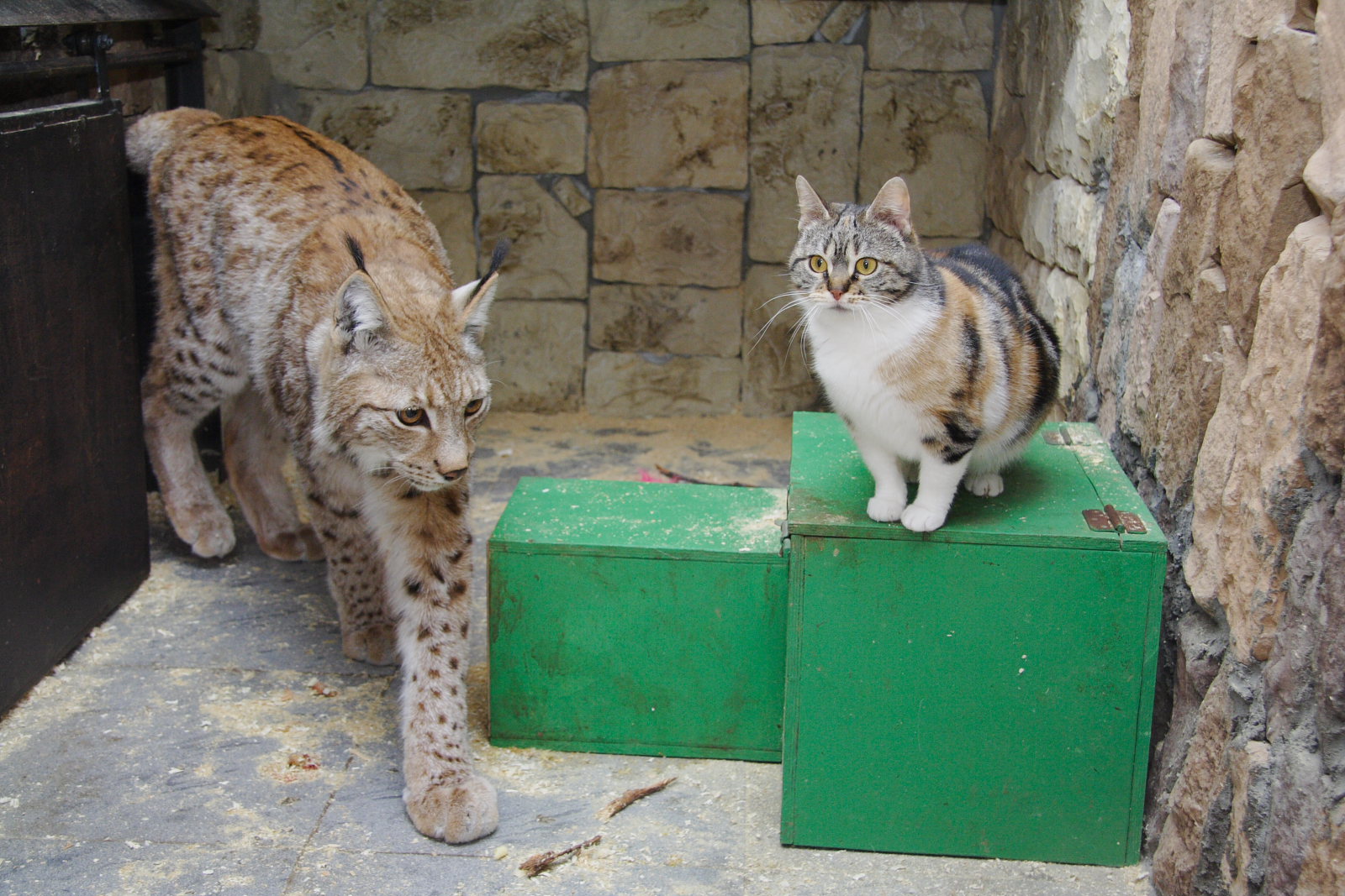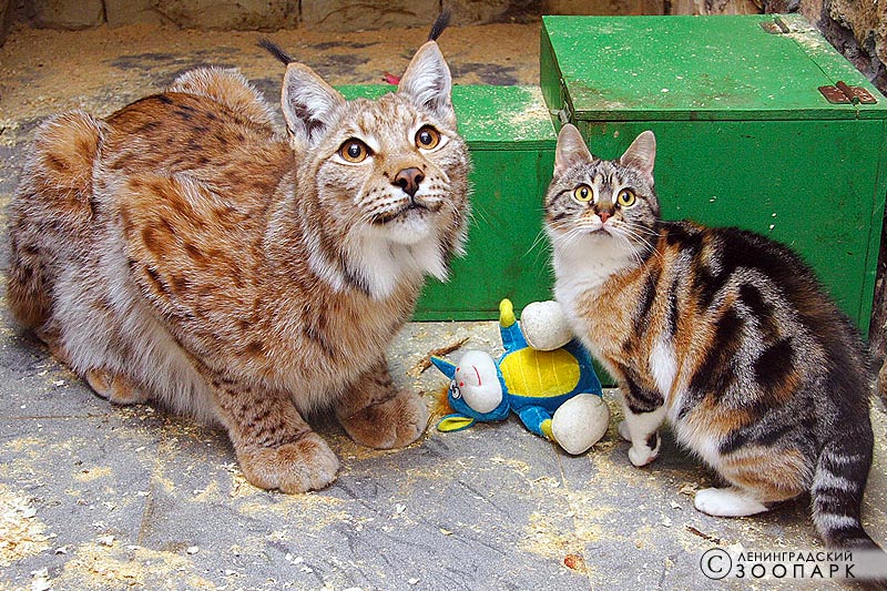 На вольере животных висит табличка: «Домашняя кошка Дуся. Живет со своей подружкой, рысью Линдой».