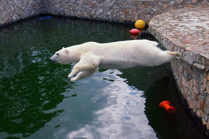 Хаарчаана очень любит всякие шарики и мячики, у нее с детства такая привычка: встать на задние лапы, взять в передние что-нибудь и топать к бассейну. Доходит до краешка, кидает себе шар и прыгает за ним — охотится. Потом она берет его в зубы и, подпирая одной из лапок, плывет к берегу. Таким же образом вытаскивает его на сушу, снова встает на задние лапы и развлекает себя. Я считаю, это потрясающе.