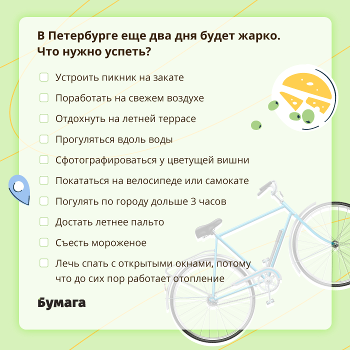 В Петербурге еще два дня будет жарко. Что нужно успеть? Чек-лист «Бумаги»