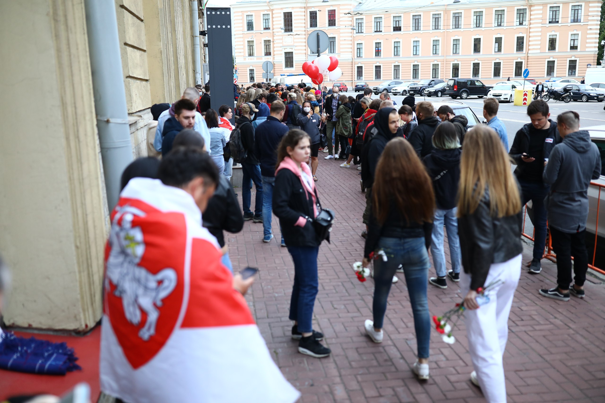 В Петербурге снова прошла акция солидарности с протестующими в Беларуси. К посольству пришли сотни человек