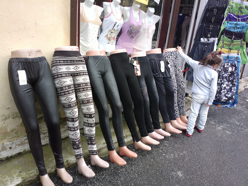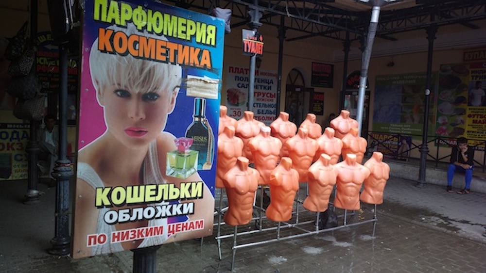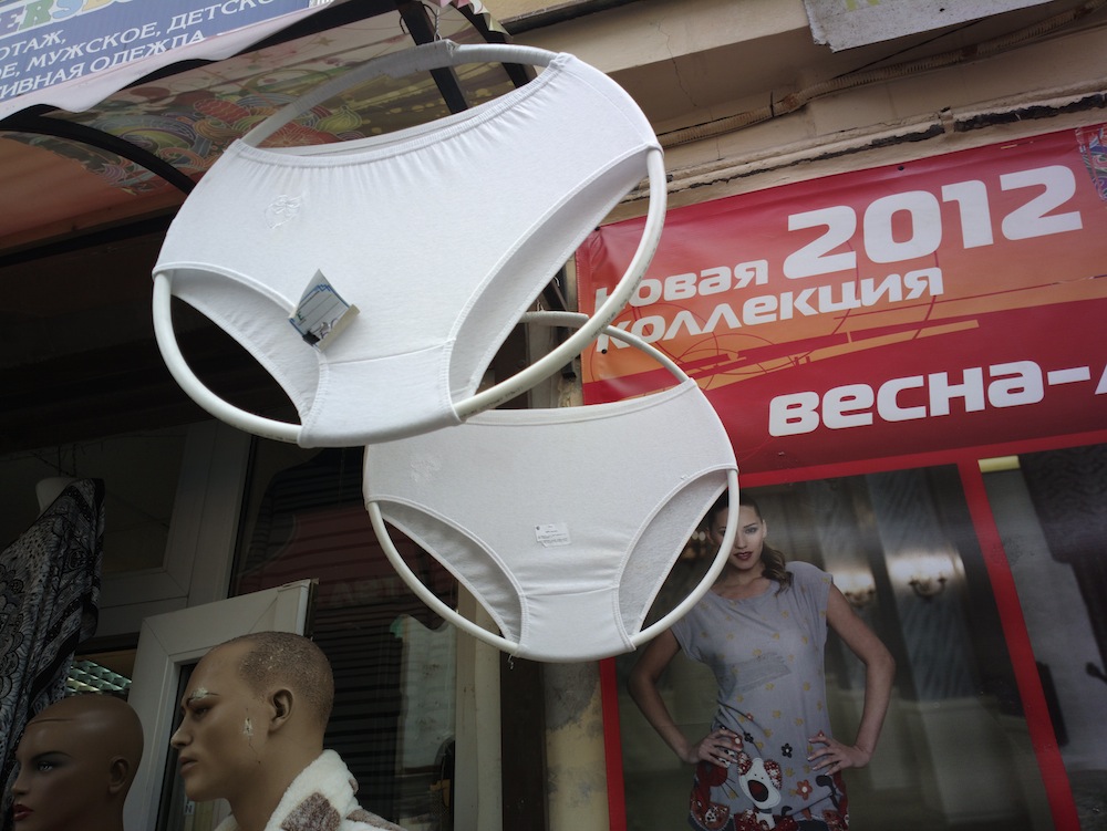В первый день Елена Пальм отправилась на Апраксин двор, в одно из самых злачных и одиозных мест в центре Петербурга, и запечатлела продавцов, покупателей, мусульманский дресс-код, исполинские трусы и мужчину в усах и с пистолетом.