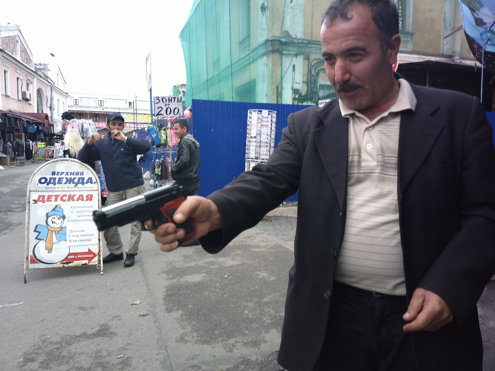 Я не смогла пройти мимо такого. Меня с телефоном мужчина не заметил, потому что в это время объяснял моему коллеге с большой камерой, что снимать на Апрашке нельзя и расстреливал его из игрушечного пистолета